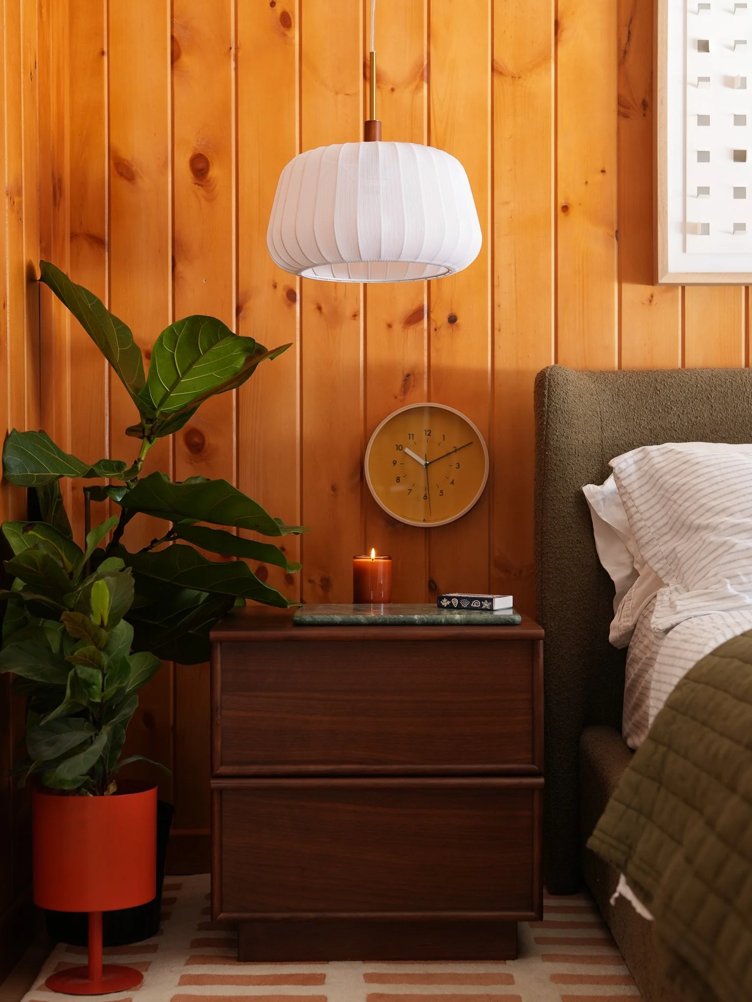We have been so impressed by this green marble decorative tray (listed as a cutting board!), that we actually bought a set for the other bedrooms, too. Small bowls, trays or trinket dishes for personal items are an important nightstand item - especially for a guest room. To make this space feel extra cozy and inviting, we added cotton pendent lights - we love that a hanging light frees up valuable space on top of a nightstand, and the ribbed cotton shade creates another layer of texture. Between the warm lighting, and Stephen's growing collection of books, we think our guests will feel right at home.